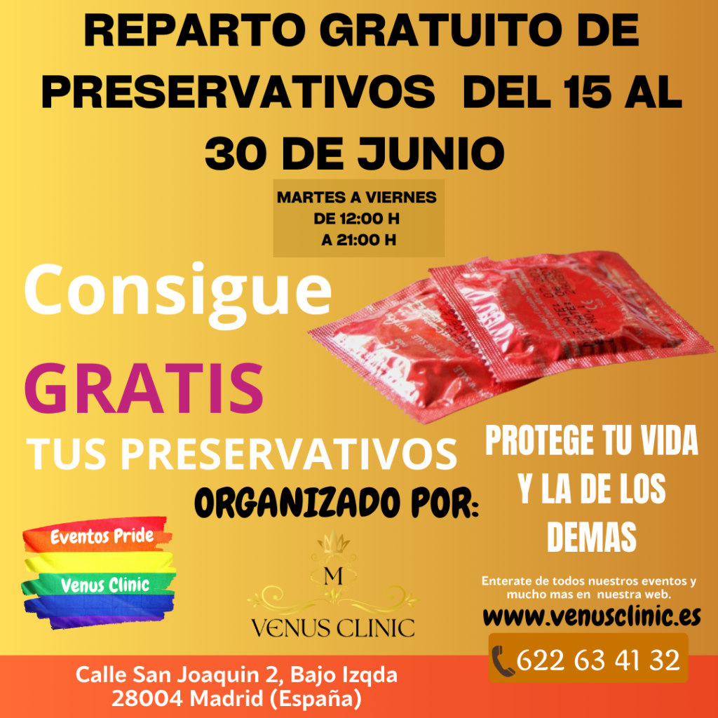 La Asociación Venus Diversidad Este llevará a cabo una campaña de reparto de preservativos del 15 al 30 de junio. El horario de distribución será de martes a viernes, de 12:00 a 21:00 horas, en nuestra sede principal ubicada en la calle San Joaquín 2, bajo izquierda, en Madrid. Esta iniciativa busca promover la salud sexual y la prevención de enfermedades de transmisión sexual entre la comunidad. ¡Te esperamos!