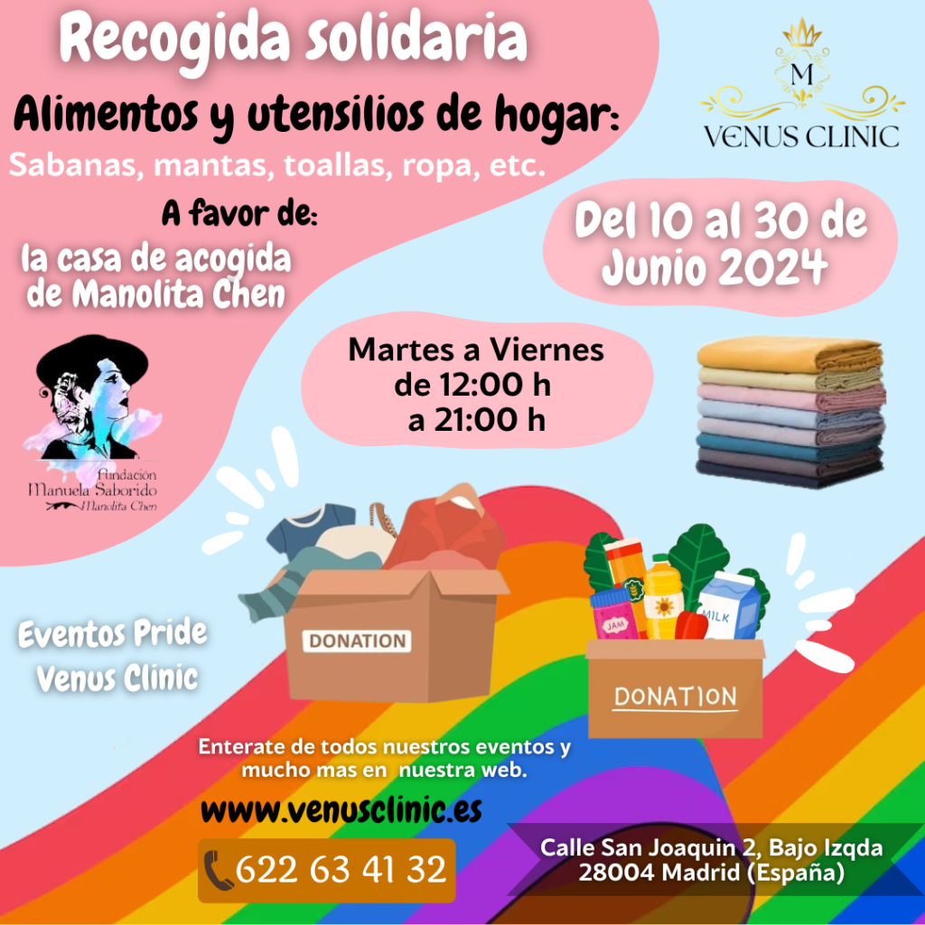 La Asociación Venus Diversidad organiza una recogida solidaria de alimentos y utensilios de hogar para la casa de acogida de Manolita Chen. Del 10 al 30 de junio de 2024, puedes colaborar donando sábanas, mantas, toallas, ropa y otros artículos esenciales. ¡Tu apoyo marca la diferencia!